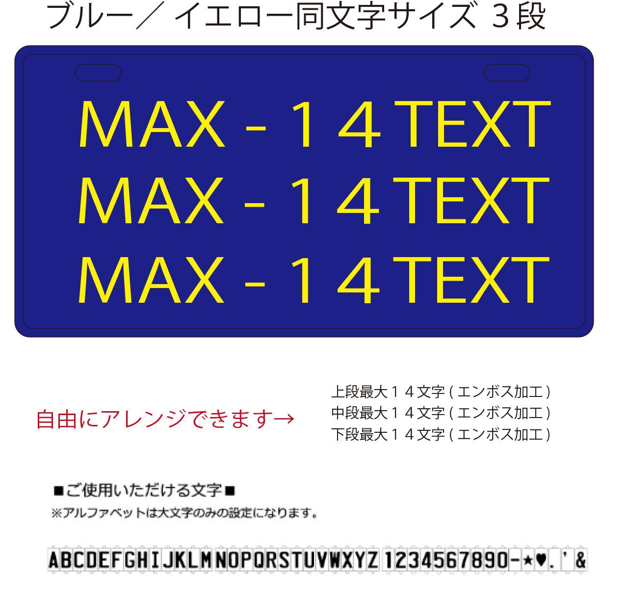 USプレート同文字サイズ3段 背景:ブルー 文字色:イエロー